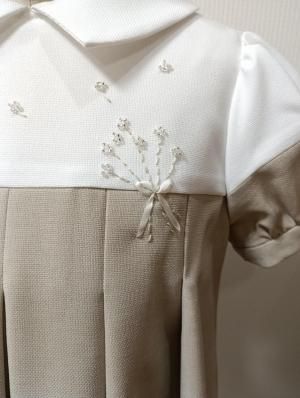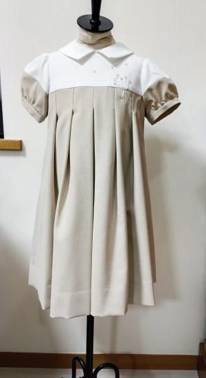 上品な、ベージュと白の切り替えのシックなワンピースです。 胸元からタックをたっぷりとってあり 女の子らしい清楚な印象です。 胸元にビース刺繍のかわいい花束をあしらって華やかな上品なワンピースです。 後ろファスナー開きで、ポリエステルの裏地が付いています。 両脇にポケットが付いているのでとても便利です。 9105のニットボレロを合わせて入学式や春のフォーマルなシーンに最適です。 [日本製]